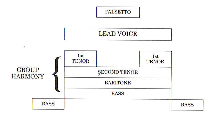Vocal Group Harmony - A wide range of voices (usually bass to high tenor or falsetto) must be combine in vocal harmony or more commonly run underneath the lead vocalist. Usually the second tenor and baritone blend together as one sound, with high tenor often falsetto running over the lead and the bass underneath.